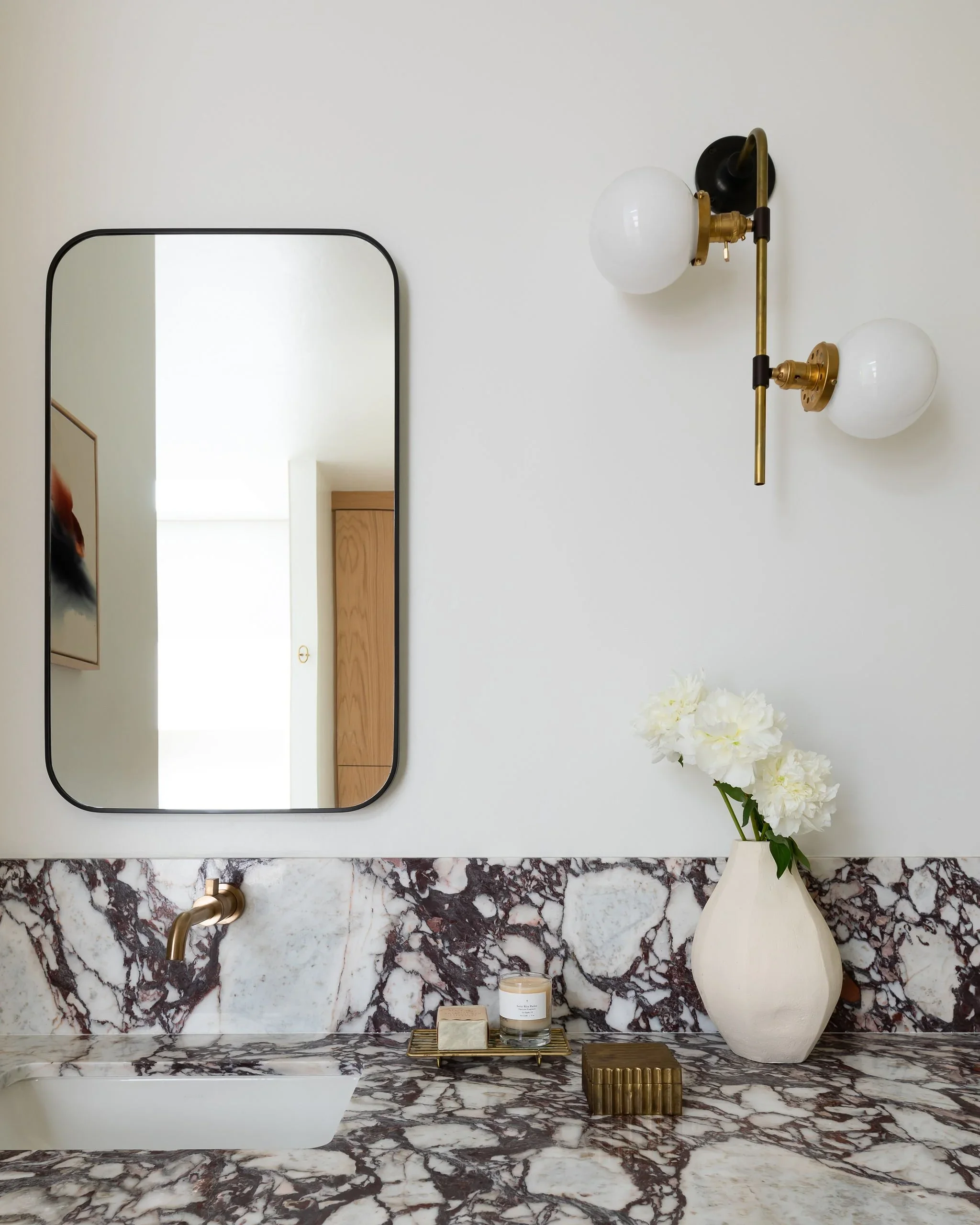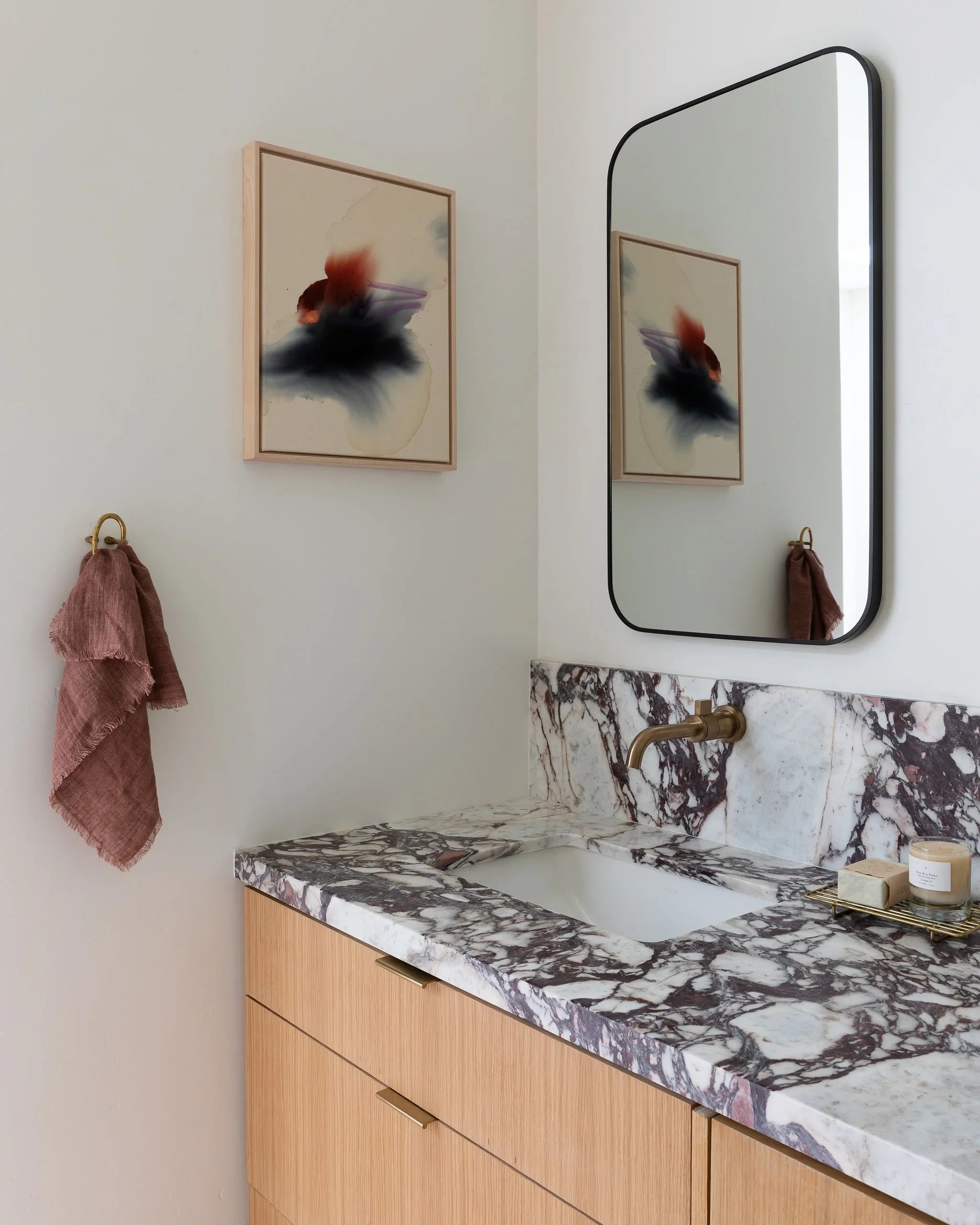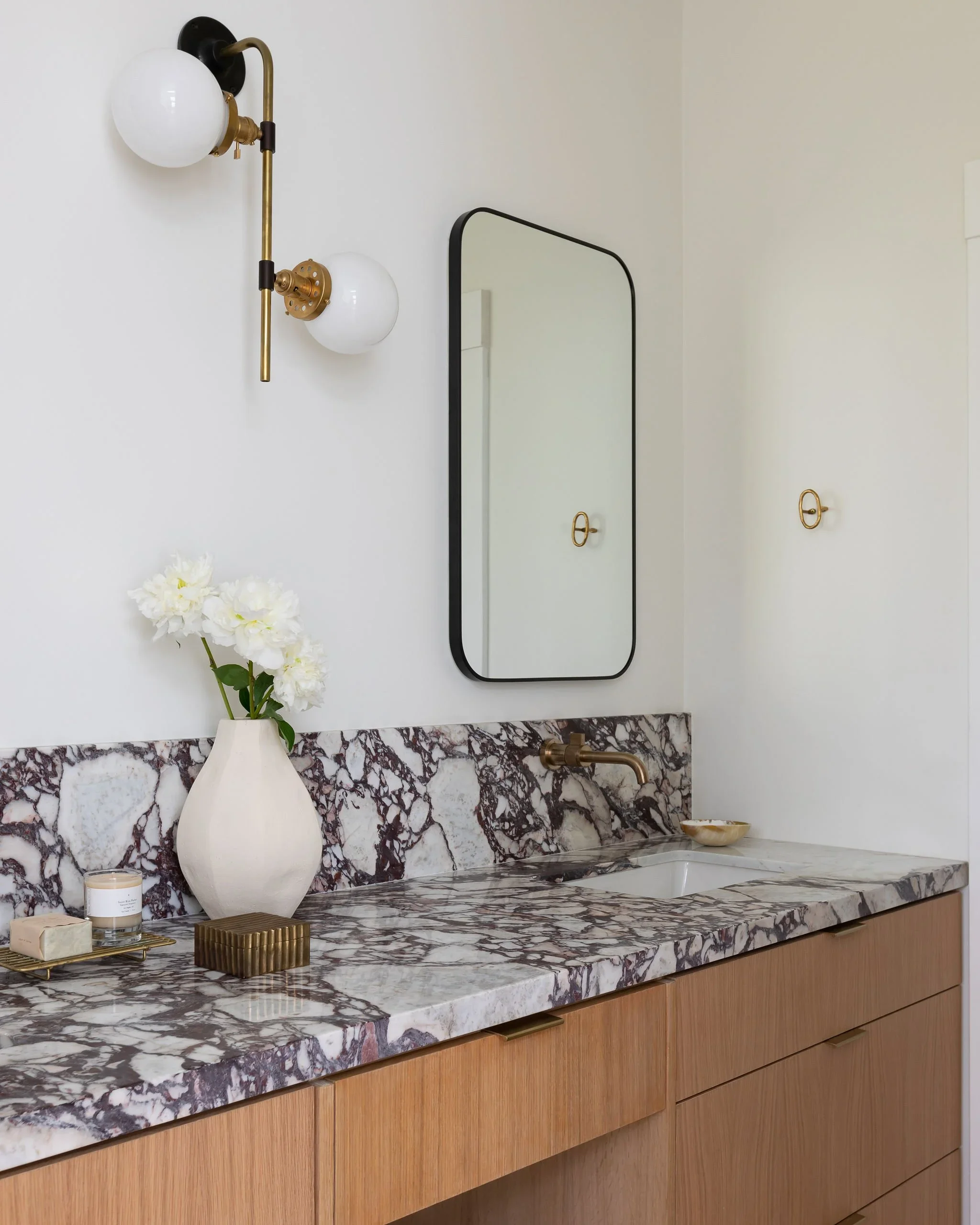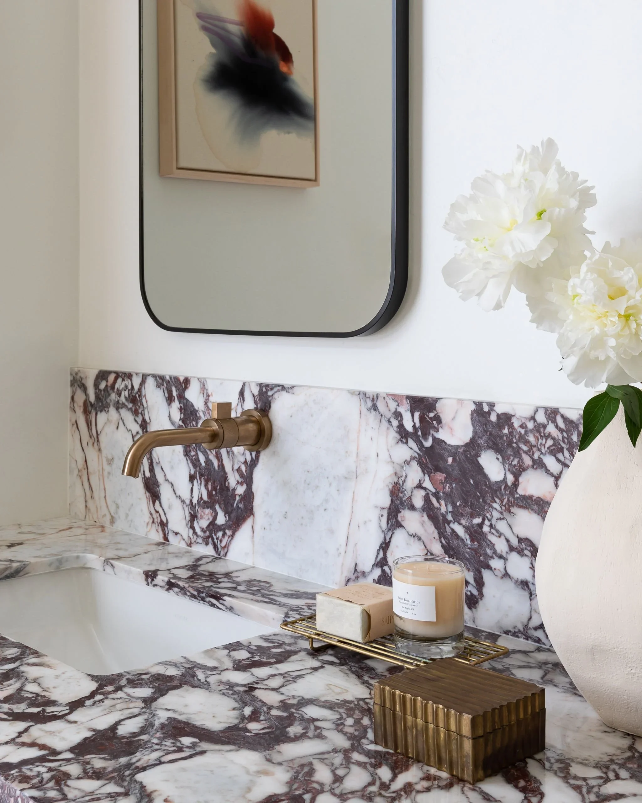 We focused on rich materials for this stunning single bathroom renovation. The Breccia marble acted as the showstopper here creating the drama for the space. Other natural materials accompanied the stone adding rich layers and darker metals were selected to add contrast and depth.