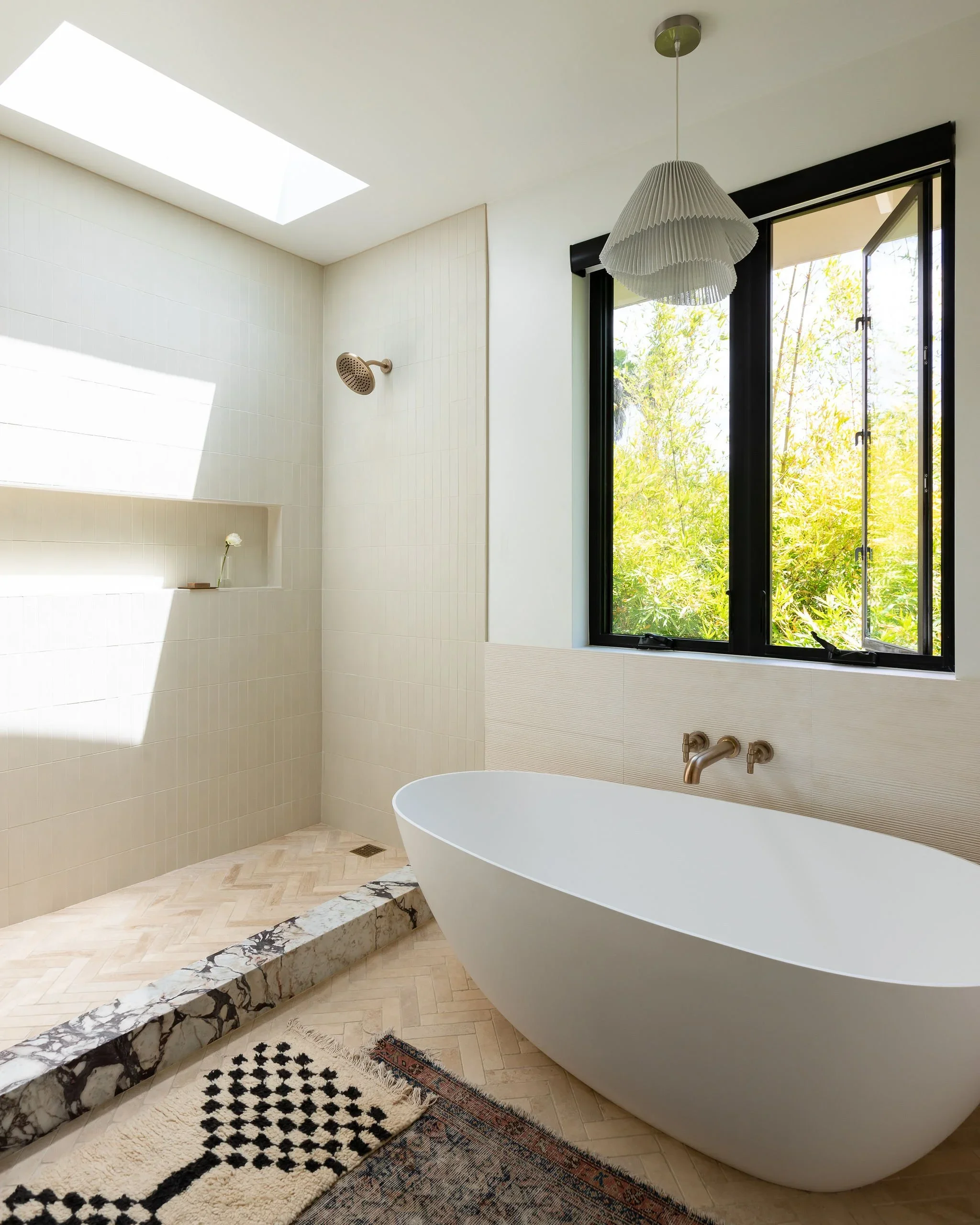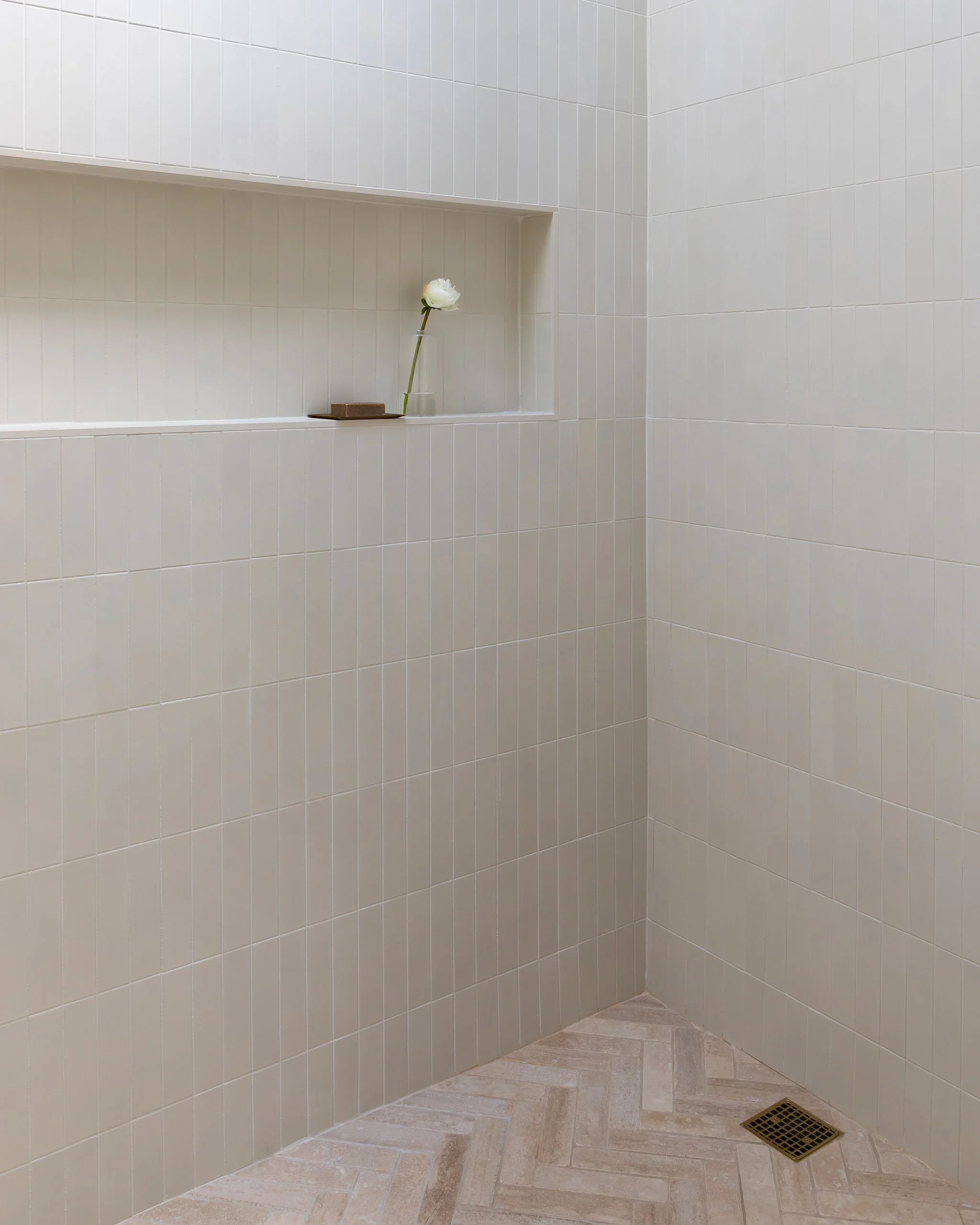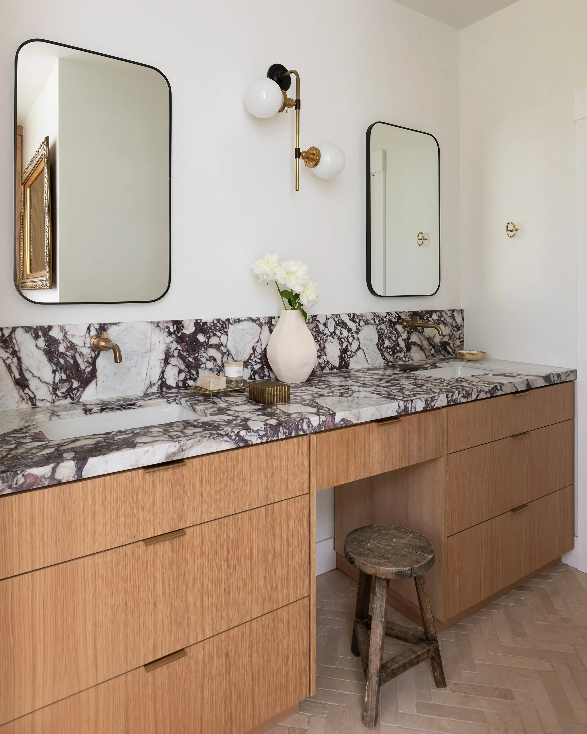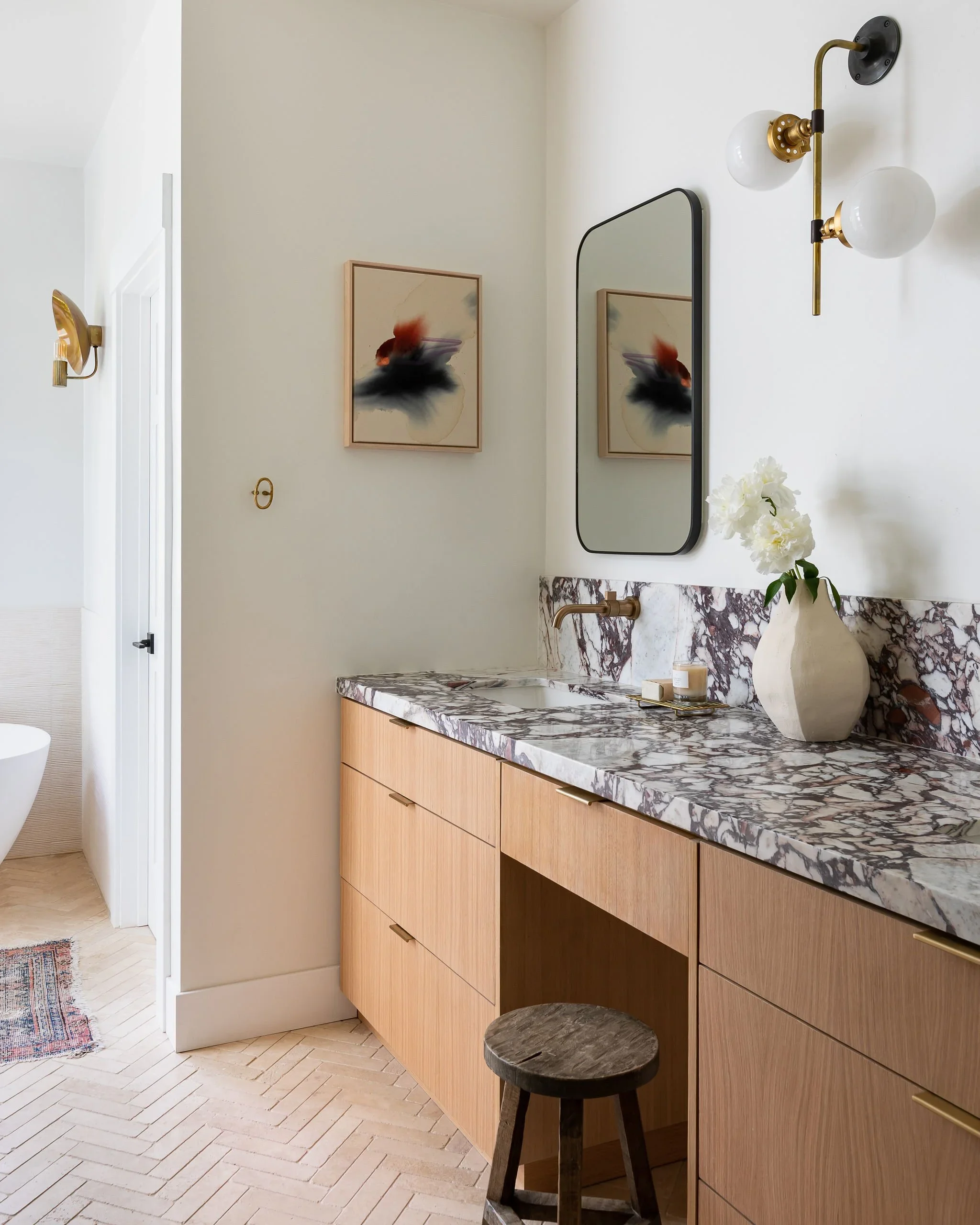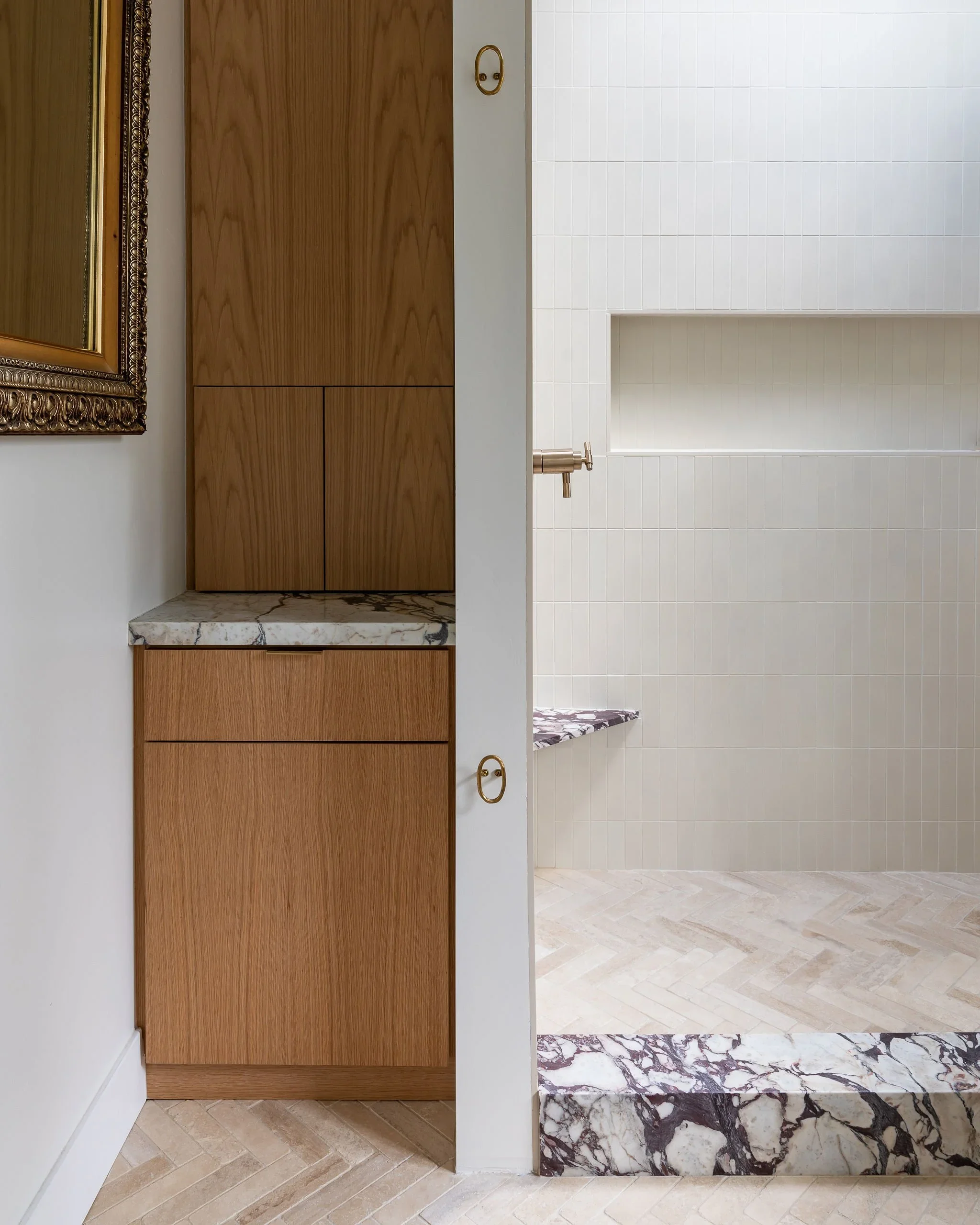 We focused on rich materials for this stunning single bathroom renovation. The Breccia marble acted as the showstopper here creating the drama for the space. Other natural materials accompanied the stone adding rich layers and darker metals were selected to add contrast and depth.