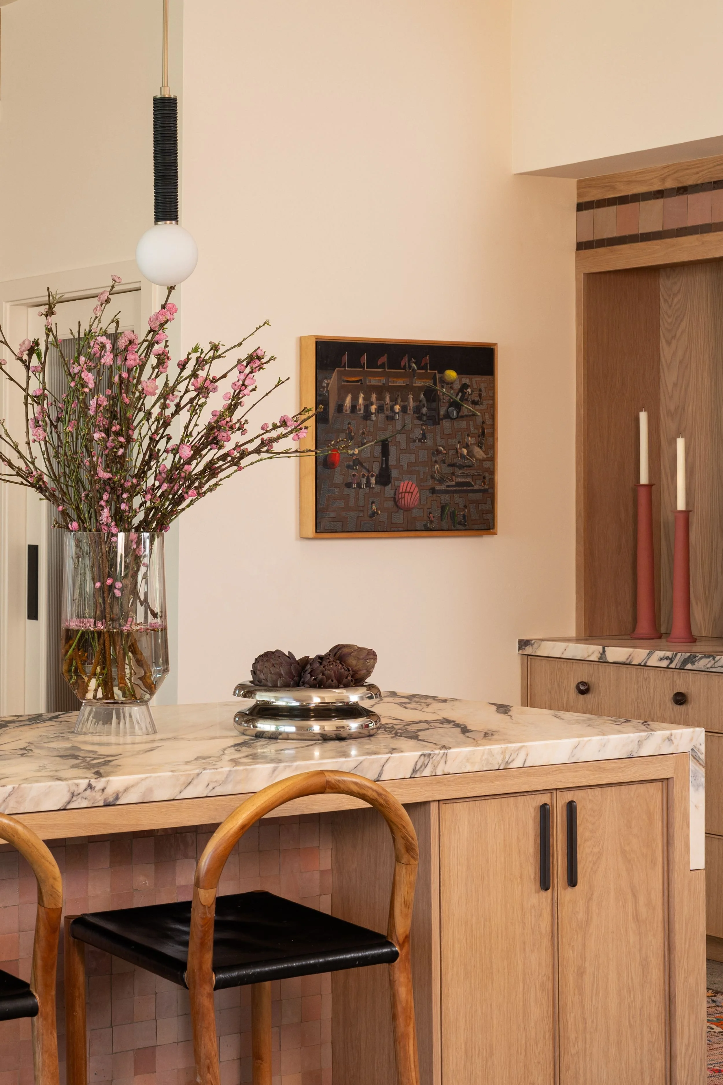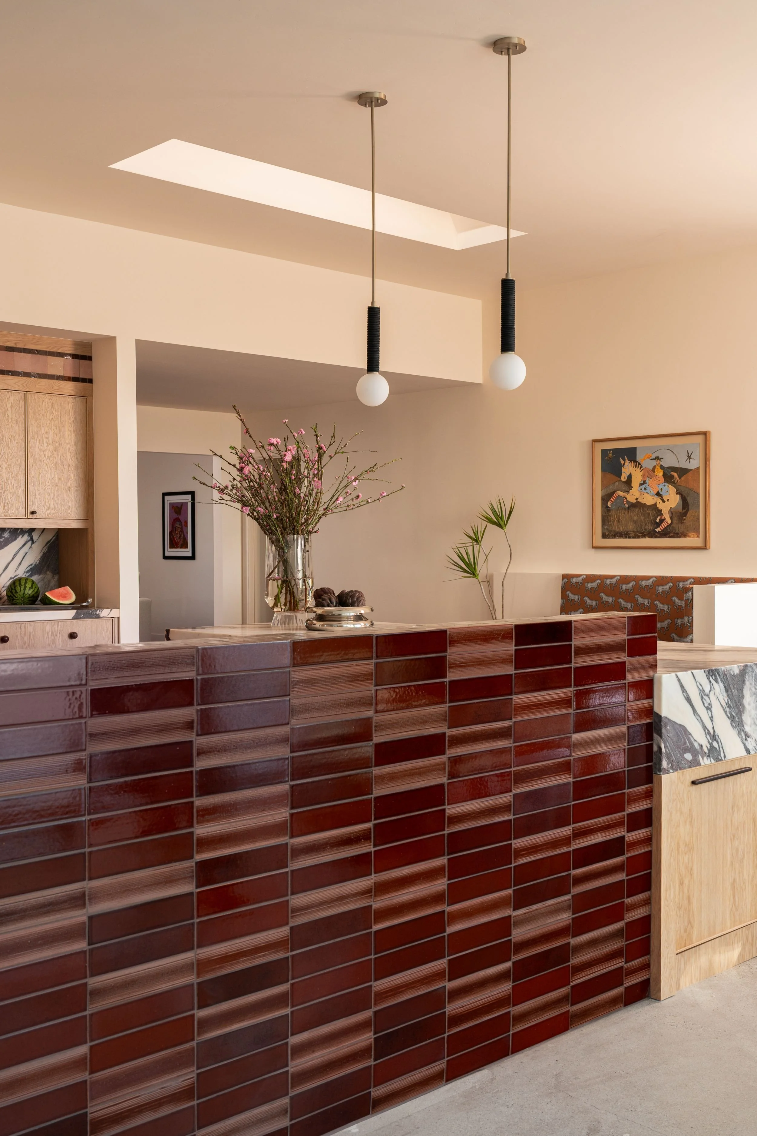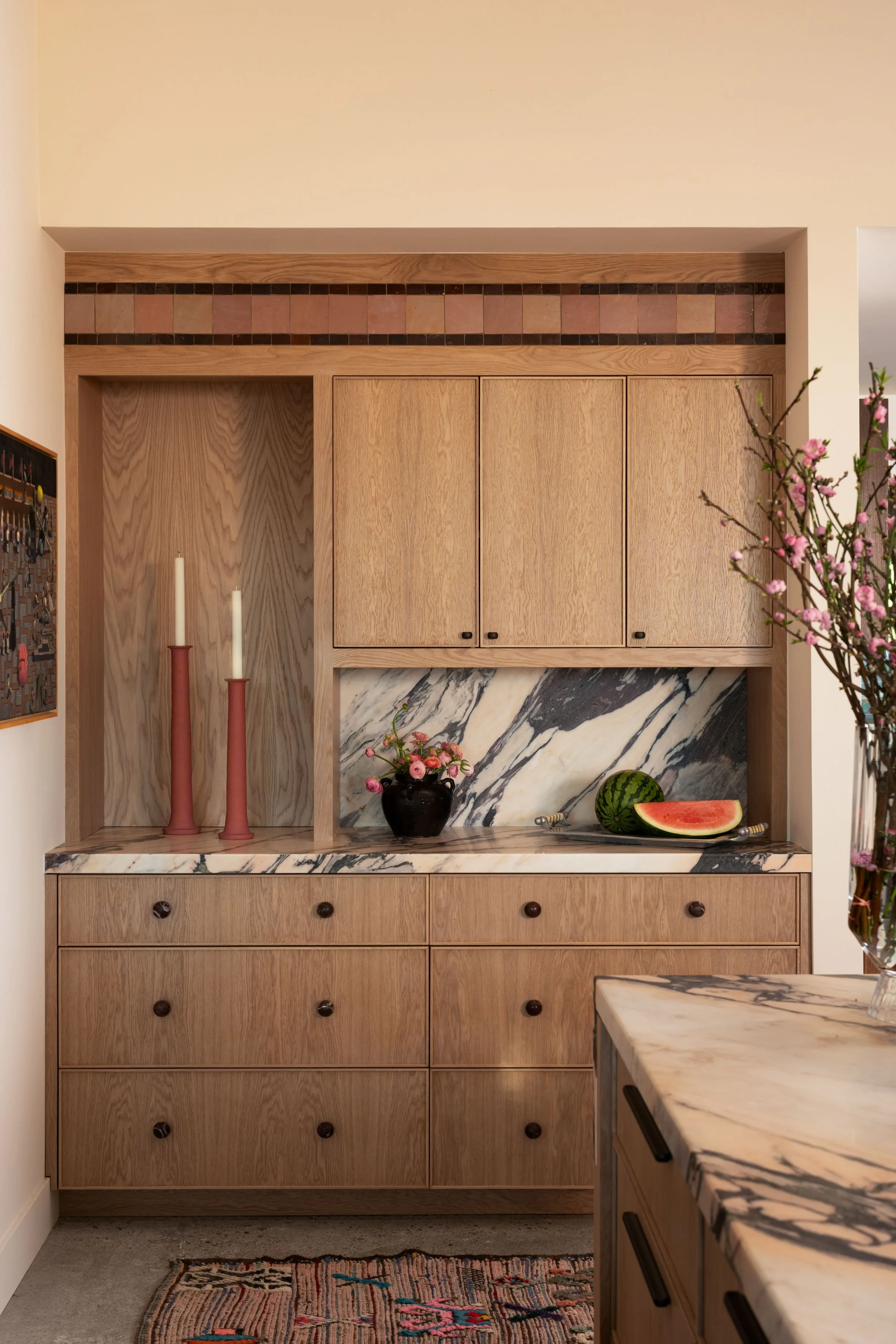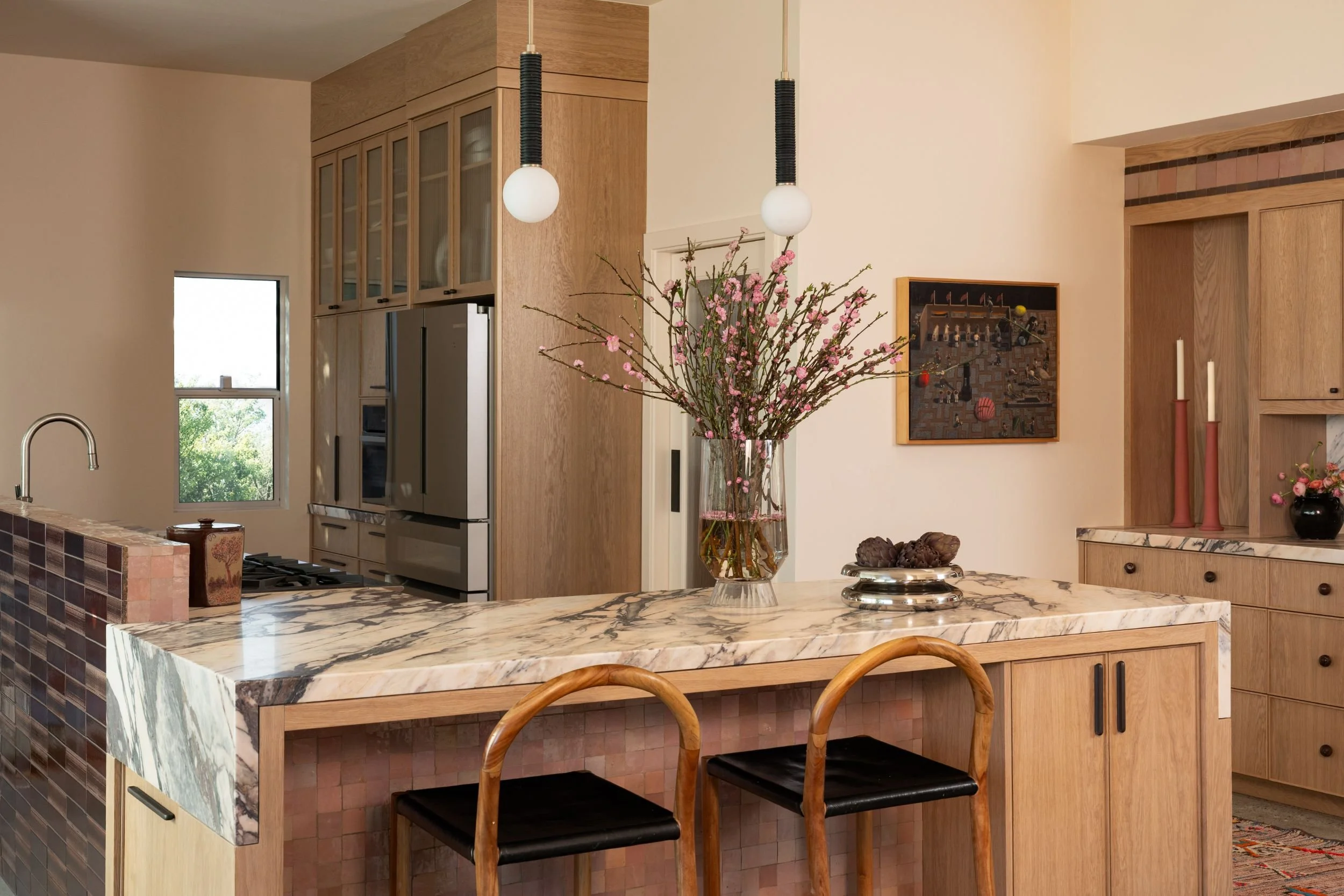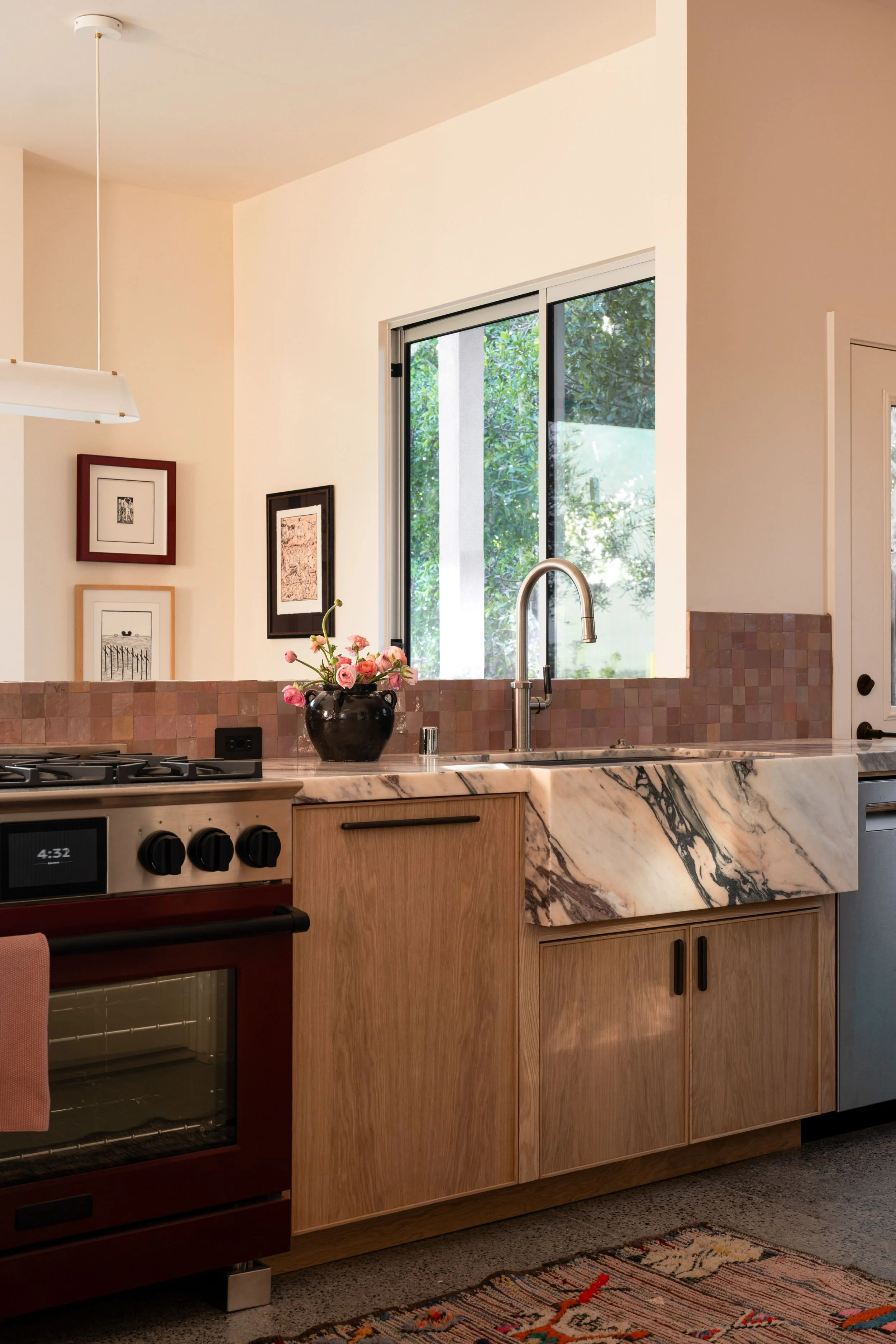 A kitchen renovation that expanded the home's footprint to create a larger kitchen and dining area — designed for both serious cooking and generous entertaining. The client's maximalist, eclectic aesthetic guided every decision: unexpected color combinations, layered tile textures, and a commitment to bold choices throughout. A statement stone and burgundy stove anchored the design from the start. The result is a space that's entirely her own.